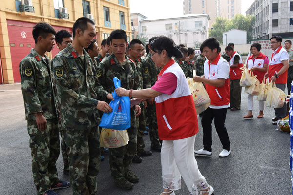 8月1日,是中国人民解放军建军节。在这天到来的前夕,7月28日、29日,淮南市红十字会和志愿者们分别来到淮南军分区、淮南市消防支队和武警淮南市支队,看望这里的官兵战士,提前为他们送来节日的问候,并为他们送来饮用水、西瓜和应急救护包等物品。