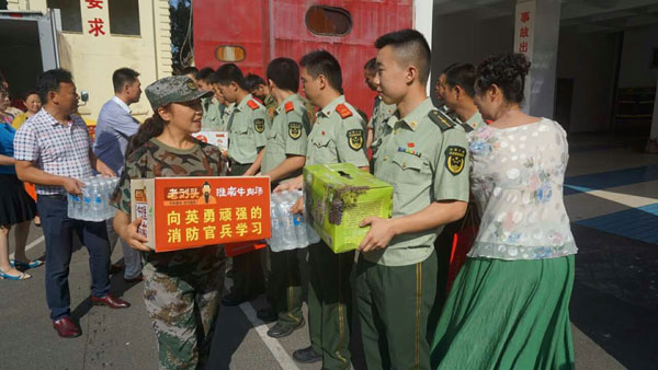 图为社会爱心人士将节日的祝福和慰问送到消防战士的手中。