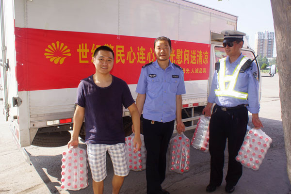 8月1日,为了庆祝建军节,发扬拥军爱民的光荣传统,谢家集区世纪阳光商厦赵萍志愿服务队的志愿者们准备了100箱矿泉水和绿茶,送给烈日下坚守岗位的谢家集消防大队武警官兵和在街头执勤的交警,用爱心为最可爱的人送去酷暑里的一份清凉,感谢他们为国家和平、社会稳定所做出的贡献。