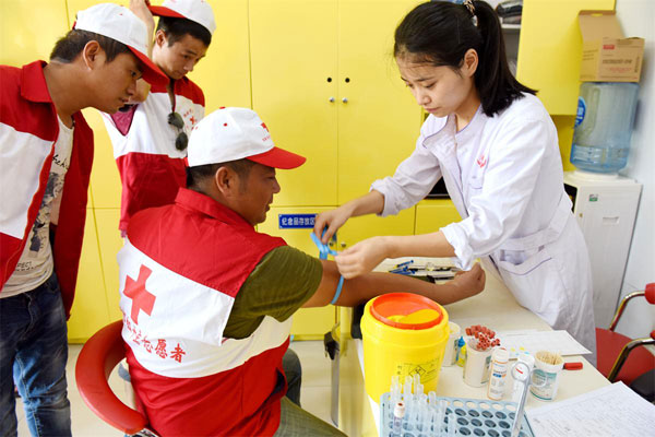 持续的高温,淮南出现了血源紧张,得知消息,市红十字会好司机志愿服务队队长赵华成等提出倡议,通过呼叫平台号召队员献血。当天,队员们身穿红十字马甲,有序地进入献血屋。红十字会工作人员及志愿者们指导填写表格。活动共有35名队员参加,其中符合条件的18人进行了献血、采样。