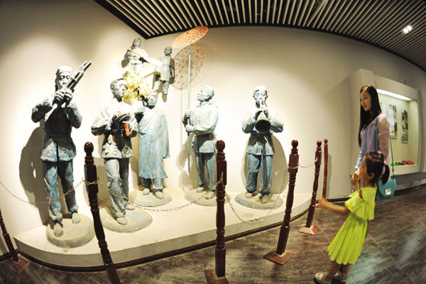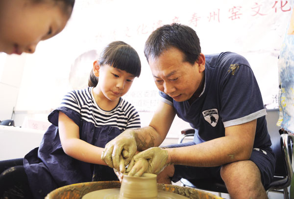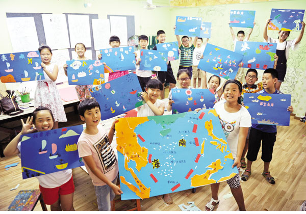 图一:田家庵区洞山街道新村社区小学生参加省级非物质文化遗产寿州窑制作技艺学习。图二:美术学校学生通过彩色纸拼贴绘画美丽的南海,展示我国蓝色国土绚丽风采。图三:寿县非物质文化遗产陈列馆内,孩子在家长的陪同下学习了解国家级非物质文化遗产寿县“抬阁肘阁”。