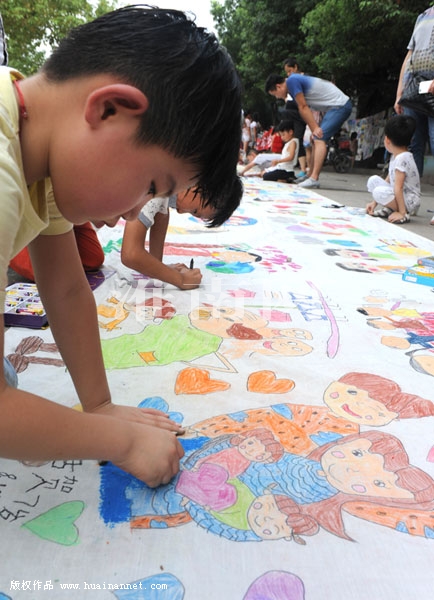 图一:凤台县留守儿童在长卷上绘画,展示免费艺术培训成果。