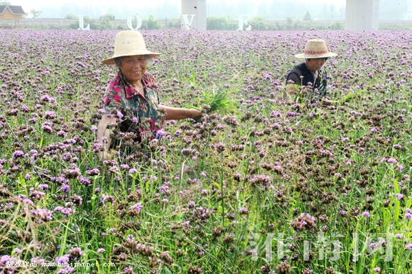 图为潘集区架河镇武庙村村民在武庙生态园中种植观赏性植物马鞭草、薰衣草,通过发展观光旅游农业实现增收。