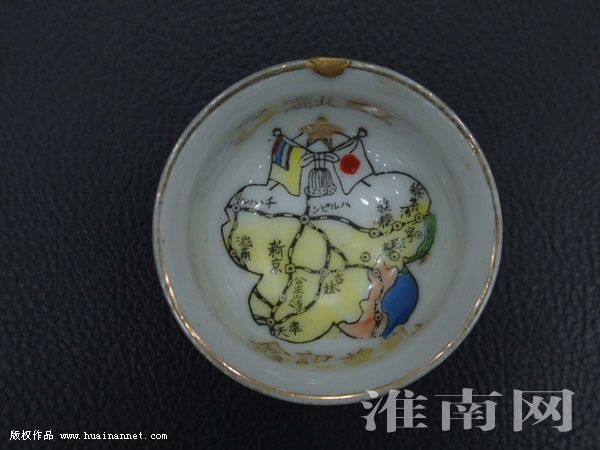 苏正礼先生在淮南师范学院图书馆楼布置有“百年教育馆”展厅,正是在这里,苏正礼为淮河早报、淮南网记者展示了他的这份藏品,其中一只小碗底面印有我东北地图,地图上方交叉着日本太阳旗和伪满洲国国旗,旗帜上方碗壁上印有“北满派遣”等字样,对面碗壁上则印有“凯旋纪念”字样。碗底地图上有着明显的铁路线,上有几个重要的地名,有奉天(今沈阳)、吉林、新京等。经查证,1932年,伪满洲国在日本帝国主义的扶持下粉墨登场,改长春为“新京”,东北全境沦陷。