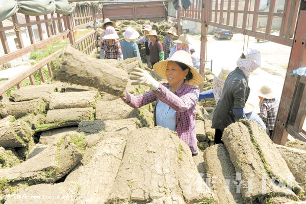 图为该县安丰镇青峰村群众近日将一批草坪装车销往外地。