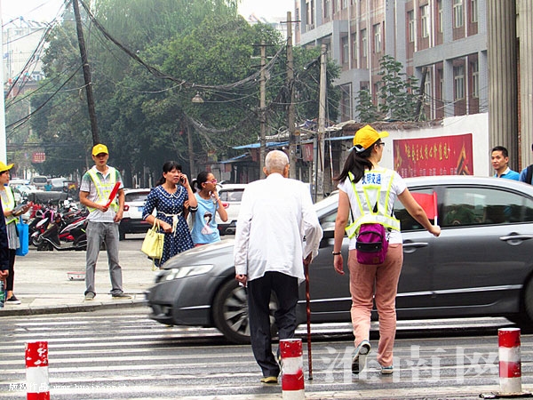 只见有的志愿者吹着口哨,劝导纠正行人不要乱穿马路、翻越隔离护栏等不文明行为;有的向路人发放文明交通宣传彩页,对老弱残者或问路的行人提供热情的帮助。“你好,小弟弟!过马路时,请不要看手机!”一名低头只顾玩手机的小男孩正要跨进斑马线时,站在一旁的志愿者及时给予劝导。“大爷,过斑马线时,您要小心呀。”今年81岁的程大爷拄着拐杖走到斑马线上,志愿者赶紧上前陪着老人一起过马路。一句句温馨提示,一次次耐心劝导,饱含热情的志愿者们及时纠正不文明交通行为,受到许多市民的纷纷称赞。