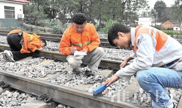 图为几名线路工正在对线路进行“三全”检查,以确保线路水平、方向、轨缝、轨距等技术指标,均符合质量标准。