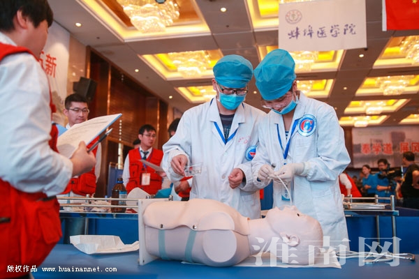 为深入推进医学教育综合改革,全面提高医学教育质量,10月21日,由蚌埠医学院主办,淮南市第一人民医院承办的蚌埠医学院2016年大学生临床技能竞赛在淮拉开帷幕,来自全国27家实习医院的33支队伍以及安徽理工大学的2只代表队,共计105名选手同场竞技、一展身手。本次竞赛参照全国大学生临床技能竞赛模式进行,全面考核大学生的临床思维、临床技能、团队精神、人文关怀和心理素质。竞赛内容包含胃管置入、成人心肺复苏、腰椎穿刺术、气管插管及吸痰术、胸腔穿刺术、小儿头皮静脉输液等多个项目。