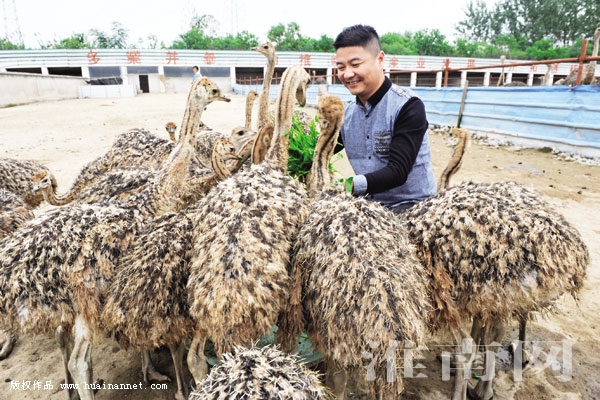 淮南国力鸵鸟观赏园通过土地流转养殖鸵鸟,发展观光旅游、休闲农业,对鸵鸟皮毛、肉、蛋进行深加工,制作皮具、工艺品,延伸产业链条,年销售收入达600万元,带动当地群众致富。图为淮南国力鸵鸟观赏园内,养殖人员为小鸵鸟喂食。