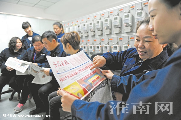 图为11月1日,国网淮南供电公司计量室检验检测二班职工通过报纸学习省第十次党代会报告。