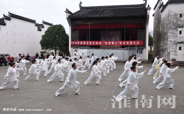 近日,黄山当地及淮南的网民“朋友圈”中热传一组一群中老年人身穿传统服装,手拿折扇,站立于徽派建筑群中,展示传统武术的照片,照片背景上的一条火红色的条幅更是醒目,上写“2016淮南市武术协会走进黄山武术交流大会”。