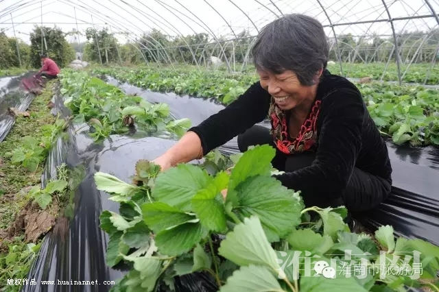 潘集区泥河镇村民在后湖生态园中为优质草莓新品种“红颜”覆盖地膜,通过科学种植增加收入。