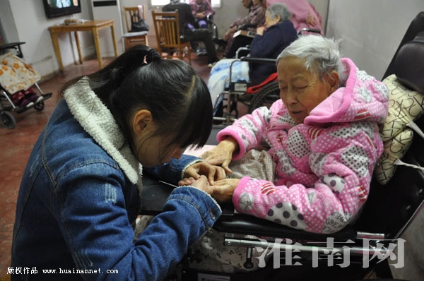 图:大学生志愿者为老人修剪指甲,聊天解忧。