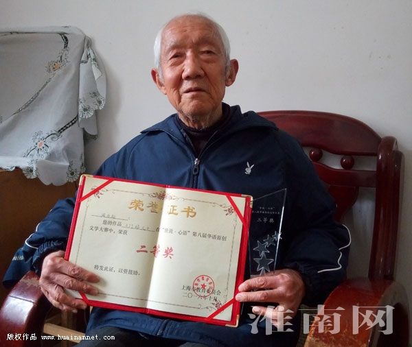 图:周为松老人展示获奖荣誉证书和奖杯