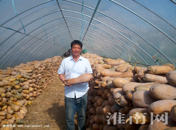 图二:看着堆满大棚的南瓜农民难掩丰收的喜悦