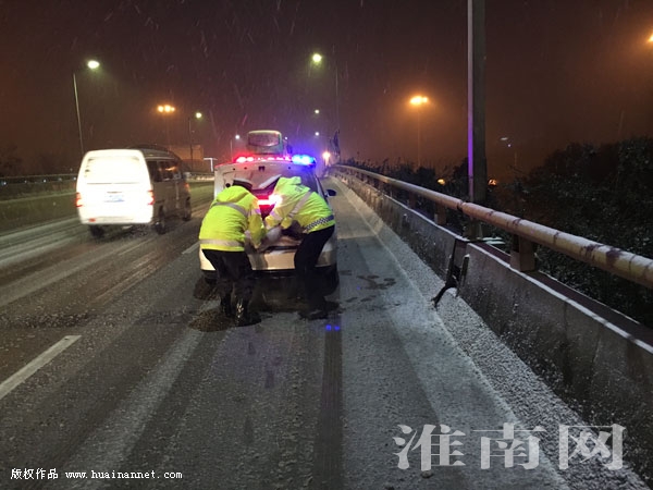 雪越下越大,风越刮越猛,交警们一直在桥上忙碌着,交警田家庵一大队三中队全体成员一直奋战至午夜12时许,直至立交桥面全部铺洒工业盐,他们才下班离去。