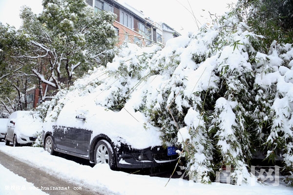 11月23日,田家庵区一小区内,被大雪压弯的竹子将一辆汽车包围。很多围观市民感叹,今年雪下得真早、下得真大,连擀面杖粗的竹子都被压弯倒伏在了地面。