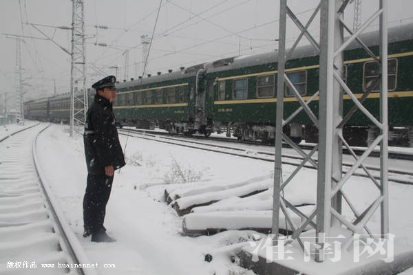 连日来,淮南铁警全力以赴应对雨雪天气,加强铁路沿线线路巡查、加强线路隐患整改、加强旅客乘降秩序维护,确保雨雪天气铁路线路安全畅通,确保旅客安全出行。图为23日,铁警加强铁路沿线线路巡查。