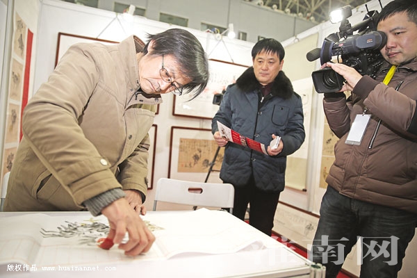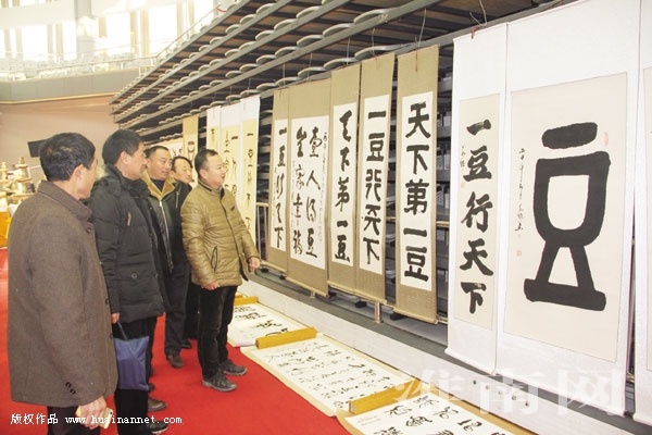 图五:凤台农技师李佩乐展示他收藏的代表淮南地域文化特色的“天下第一豆”书法作品