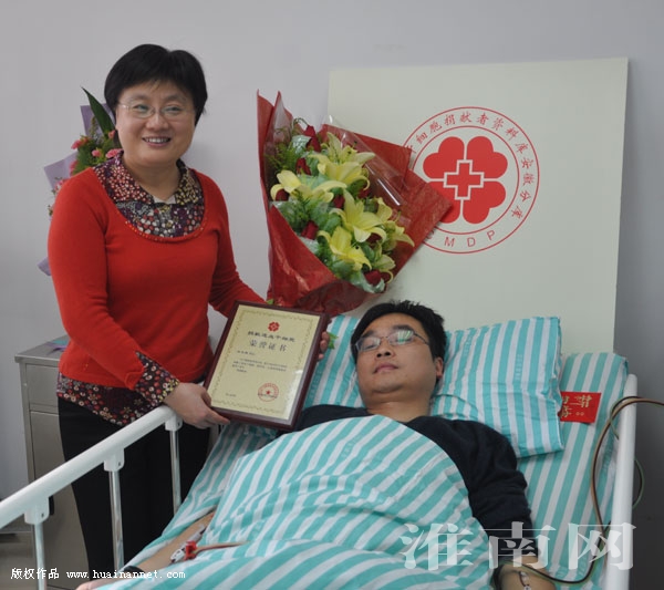 12月5日上午,经过9次动员剂注射后,乔龙旗安静地躺在捐献床上,血液通过右手的无菌管流入血细胞分离机,分离出救命的干细胞,再从左手的无菌管流回体内。造血干细胞采集工作从上午8时30分开始,12时30分结束,历经5个小时。乔龙旗共捐献造血干细胞悬液180毫升,这些“生命种子”, 将被第一时间用于救治广东一名花季女孩的生命。脸上洋溢着灿烂笑容的乔龙旗向淮河早报、淮南网记者打了声招呼。“没有其他感觉,只是开始时有些紧张,不过我的情绪慢慢地平复了”乔龙旗说,爱的传递,能为淮南增添新的正能量,正能量与正能量互相激荡,就会激发更多人参与爱的传递。