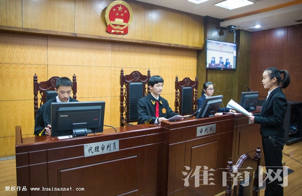 近日,淮南市中级人民法院联合洞山中学一同开展了“模拟体验少年法庭”活动。法官带着师生代表参观了立案大厅、诉讼服务大厅、智能化多功能审判法庭等地,用通俗易懂的语言,简明扼要地讲解审判法庭的组成人员以及整个法庭的格局布置、法庭审判的步骤和程序等,同时,学生们还走上审判台,敲响法槌,当起了“小法官”,亲身体验了法庭审判的神圣和庄严,感受司法的公正和力量。图为“开庭”现场。