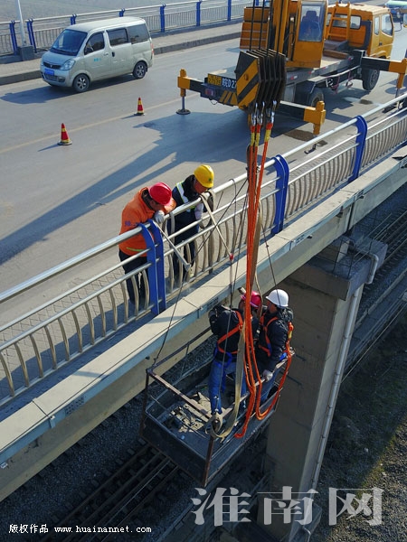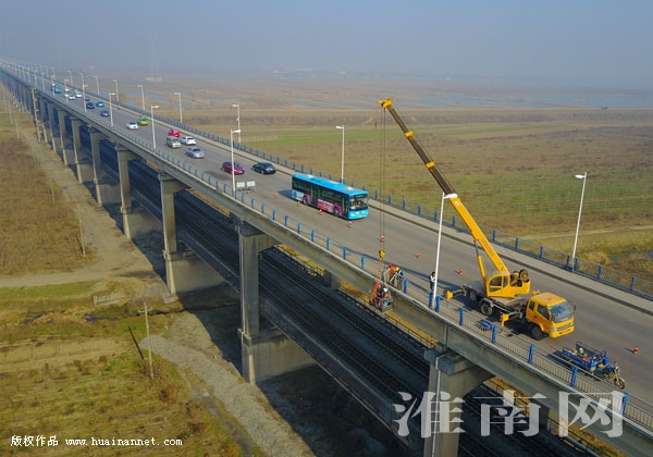 12月8日,淮南平圩淮河大桥上,工人们正在对大桥进行检修。据了解,从12月7日至2017年5月30日,淮南平圩淮河大桥主桥及引桥将进行为期半年的半封闭“体检”。淮南平圩淮河大桥是公路铁路两用桥,曾是淮南市的标志性建筑之一,1977年开工修建,1980年10月10日完工通车,是连接淮南亿吨煤基地潘集区和主城区以及206国道的唯一通道。