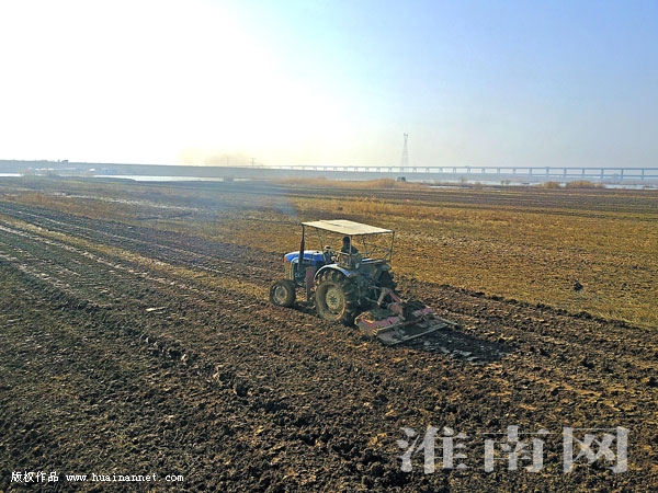 12月8日,田家庵区安成镇王巷村农民在淮河岸边进行土地耕整。时值冬日,我市广大农民利用晴好天气,抓紧土地耕整,为开春各类经济作物播种做好准备,乡村各处呈现出一派冬日的繁忙景象。