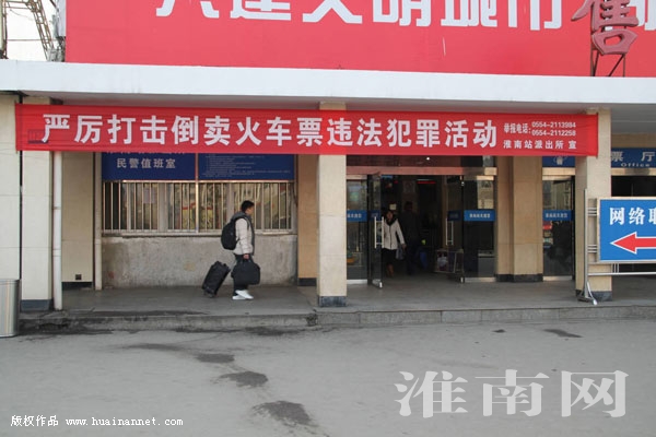 12月14日上午,淮河早报、淮南网记者在淮南火车站看到,铁路派出所已在售票大厅门前拉起打击倒卖车票违法犯罪活动的宣传横幅,同时有民警正在几处显眼位置上张贴宣传告示,横幅和告示上均留下了举报电话。