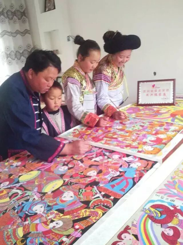 熊师提与丈夫周洪德的家,在六盘水市水城县陡箐镇陡箐村猴儿关组。这里是远近闻名的“中国农民画之乡”,土生土长的熊师提从小深受苗族文化的影响,熟练掌握了挑花、蜡染、刺绣等少数民族手工技艺,这几年她创作的农民画还多次获得国家、省、市各种奖项。