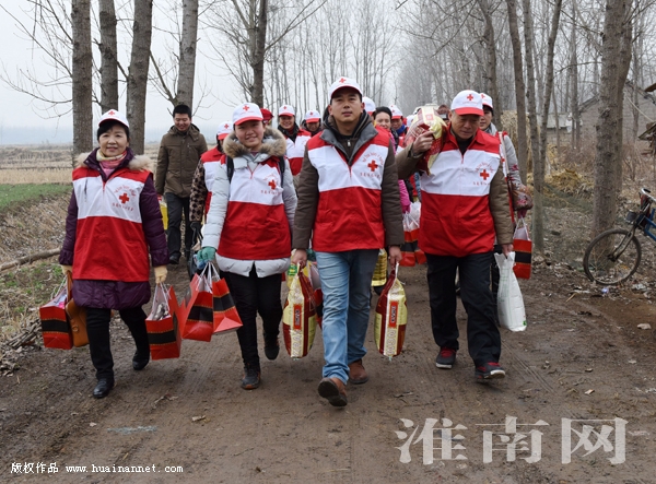 图:张宝(第一排右二)和志愿者们走在博爱送万家乡村的小路上。