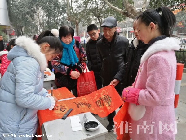 1月18日上午,来自田家庵区第十六小学的7位小学生利用特长,在校门口举行“写春联 赠市民”爱心公益活动,为节日增添了喜庆氛围。
