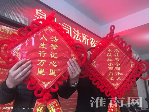 1月24日下午,在田家庵区泉山街道,即将期满解除社区矫正的刘某收到了一个红通通的中国结,上面印着“人生行万里,法律记心里”新春寄语。刘某看着红通通的中国结,紧紧握着泉山司法所工作人员的手,高兴又激动。