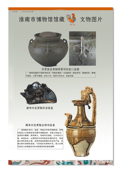 春节期间淮河早报、淮南网记者走进市博物馆,欣赏到了全国博物馆馆藏鸡文物图片展。特别引人注目的是淮南市博物馆选送的不可多见的,有铜制、瓷器、书画为载体的鸡造型文物,其中,唐寿州窑黑釉凤首瓶盖、隋寿州窑青釉龙炳鸡首壶等7件非常引人注目。