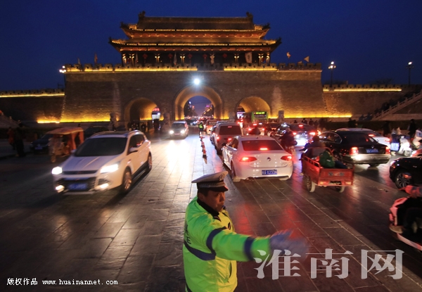 春节期间,随着返乡车辆和旅游车辆的剧增,寿县古城峰值日进出城的车辆超过万余辆(次)。对此,寿县交警大队针对古城区特殊的地理局限性,每天从早晨6时到晚上8时,在进出城主要路口,坚持加班加点、全员上岗,确保节日期间各路段基本畅通。图为2月9日傍晚,交警在通淝门(南门)下疏导交通。