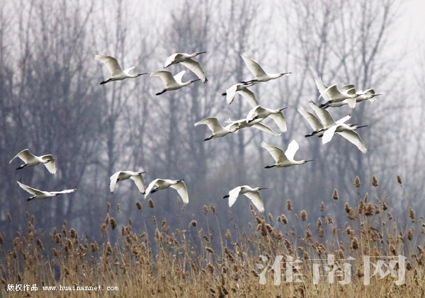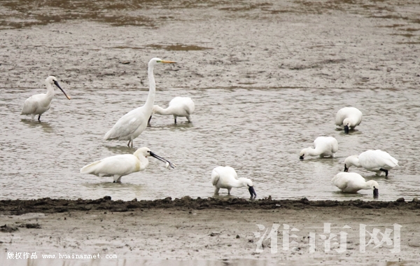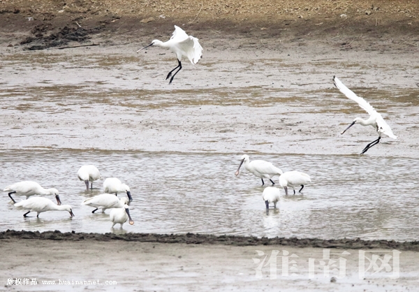 春节刚过,记者采访时惊喜地拍摄到一群近百只的白琵鹭,在寿县新城区东南3公里的浅滩湿地逗留觅食。