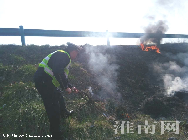 2月13日下午3时许,市交警支队高速大队民警巡逻至滁新高速153km+300m处时,发现路面被浓烟笼罩,严重影响了驾驶员的行车视线,隐患极大。民警立即拉响警报,提醒过往车辆采取紧急措施减速避让,并靠边停车查看火源,发现浓烟是从高速公路路基处飘来的,竟然是护坡上着火了。民警从附近的绿化带找来一根1米多长的树枝,用力拍打火苗,将熊熊燃烧的火苗扑灭。将火焰扑灭后,民警仔细检查,零星火星也不放过,防止火情复发。