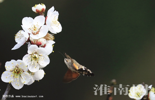 2月19日,洞山宾馆院内梅花丛中,一只美丽的蜂蛾如精灵般在繁花枝头穿梭、采蜜。