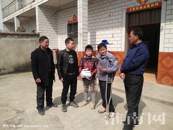 2月28日上午,田家庵区罗马广场社区负责人和“淮南好人”张甫一行人驱车90余公里,来到寿县隐贤镇姚祠村,给贫困户杨元豹送来2000元爱心款,并给他的孩子带来学习用品,又给重点贫困村姚祠村捐助了一台价值千余元的打字复印一体机。