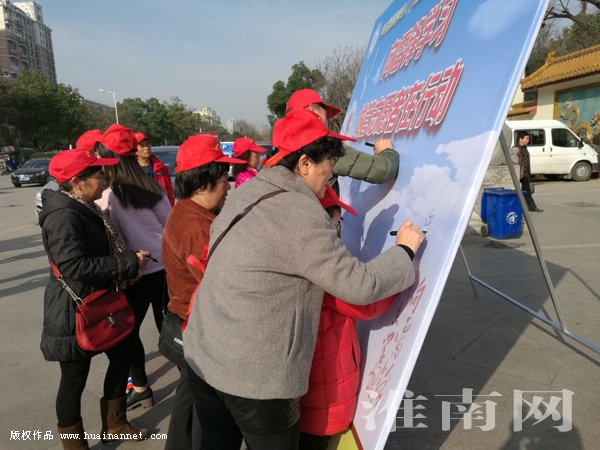 3月4日上午,在龙湖景区南门,一群身穿红色马甲的志愿者吸引了众多过往行人的目光。为进一步弘扬和践行雷锋精神,来自田家庵区城管志愿者协会的100余名志愿者齐聚景区南门,承诺签名,学习雷锋精神。