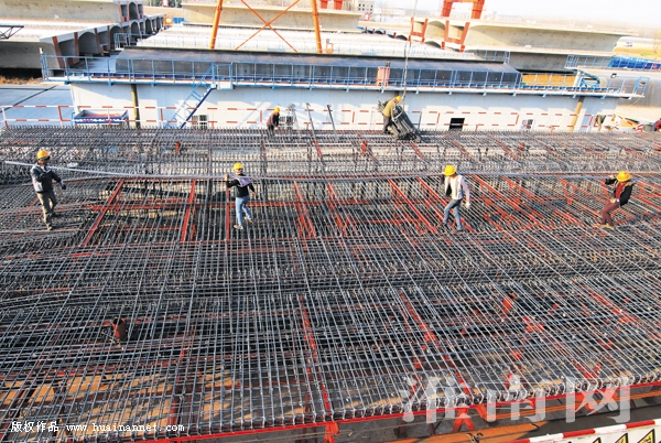 3月9日,中铁上海工程局二公司淮南制梁场工地,工人们正在紧张地忙碌,绑扎、浇筑面长为24米和32米、重量达600吨至790吨的高铁桥梁。据了解,随着商合杭高铁建设的推进,我市境内高铁线路进入桥梁架设阶段。该制梁场位于淮南南站西侧,承担60余公里的制梁任务,他们坚持科学规范施工,保质保量保工期,3月中下旬相继出场铺设。