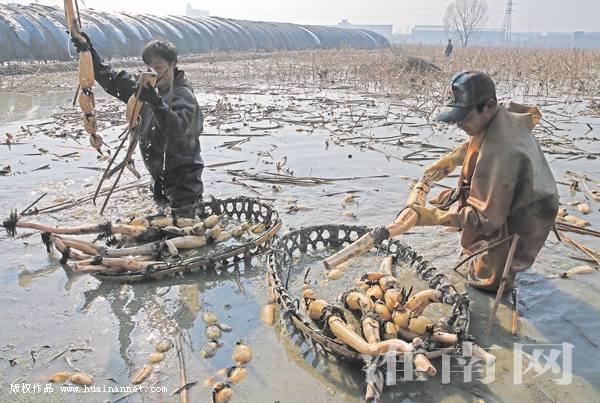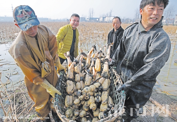3月14日,莲藕种植专业合作社社员正在采摘莲藕。由毛集实验区供销社领办的淮南市荷连天莲藕种植专业合作社,以“合作社+公司+农户”模式,首期流转土地6000亩,采取订单生产,全部种植与安徽农业大学合作研发的莲藕新品种“瑞源一号”,亩产莲藕2000公斤以上,亩均收入达12000元,带动40户农户年户均增收15万元左右,经济效益和社会效益明显。