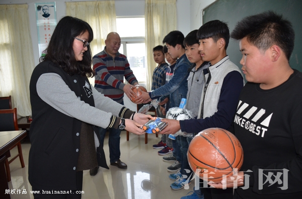 图:吴雨婷曾经的启蒙教练(左二)、助教(左一)给杨公中学的学生分发体育器材。