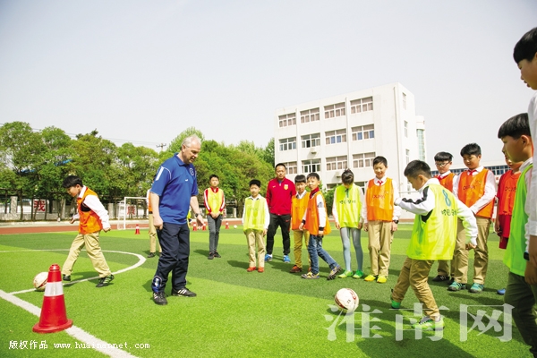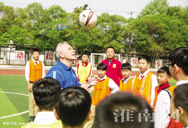 近年来,我市重视校园足球发展,先后建成国家级校园足球特色学校41所,市级校园足球特色学校100所,通过校园足球“走出去,引进来”等举措普及校园足球。图为4月19日上午,来自德国杜伊斯堡市足球队教练和淮师附小洞山校区的孩子们进行足球交流。