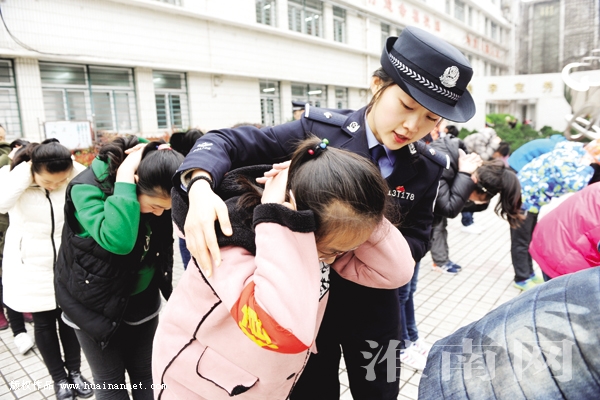 图为:安徽省淮南市公安局田家庵分局民警走进淮南师范附属小学,开展防踩踏、自我保护指导。(陈 彬 摄)