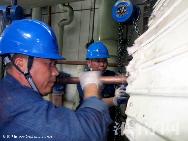 4月24日,工人们在检修一号机组高压加热器。中煤新集利辛发电有限公司通过点检定修等管理举措,抓好设备基础管理,确保发电效率。今年以来,两台机组累计发电31.14亿度,一季度实现利润8000多万元。