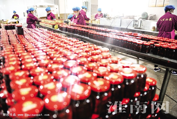 寿县八公山豆制品有限公司围绕特色豆制品做文章,以豆腐乳为主打产品,积极研发新品,先后生产出人参腐乳、何首乌腐乳、茶油腐乳等50多个品种的豆腐乳,满足消费者不同口味需求。图为工人加工生产豆腐乳销往全国各地。
