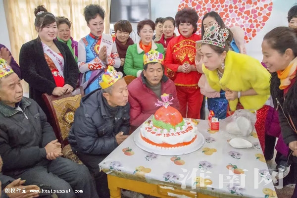 图:刘伟红(右二穿黄色衣服)在敬老院陪老人一起过生日(资料图片)