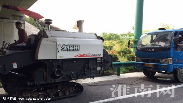 据悉,当天上午8时许,市交警支队高速大队民警巡逻至滁新高速144公里(淮南收费站北500米路段)发现,远处一辆蓝色货车在应急车道上缓慢行驶。随着距离越来越近,民警看到了惊奇的一幕,只见,这辆蓝色货车竟然被一辆联合收割机拉着走。民警立即将其拦下,询问后,得知该车是从寿县完成收割作业后准备返回江苏邳州,在行驶至淮南收费站北500米路段时,载着收割机的蓝色货车突然发生故障,无法启动。驾驶人毛某考虑到请求施救会产生费用,遂自作聪明将所载收割机卸下后使用绳索拖行故障货车。