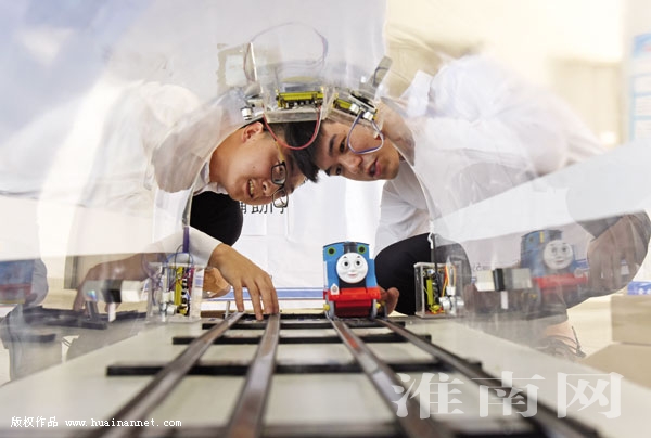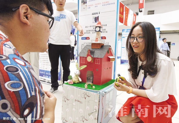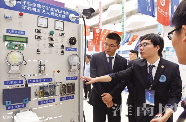 图一:安徽理工大学学生介绍“地下轨道变形监测预警系统”科技作品工作原理。该项发明提高地下轨道交通安全性。图二:合肥工业大学学生介绍“基于移动流媒体网络的矿井机车无人驾驶系统”工作原理。该系统可大幅度减少运输事故,提高矿山生产效率。图三:安徽新华学院学生介绍“高精度体感交互式智能手势控制器”工作原理。该项发明作为一种可穿戴的手势控制器,通过手势可以控制小车、电灯、窗帘等智能家居。