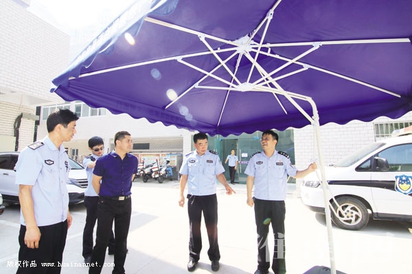 6月9日,“感动淮南十佳人物”、君临帝景酒店董事长常守君带领员工,来到淮南交警支队田家庵一大队,为在高温下执勤的交警送去了8顶特制遮阳伞。常守君告诉记者,酷暑时节来临,交通警察每天在炎炎烈日下坚守岗位,确保道路通畅很是辛苦,作为市民应该多理解、多支持他们的工作,送上遮阳伞也是表达一种心意。